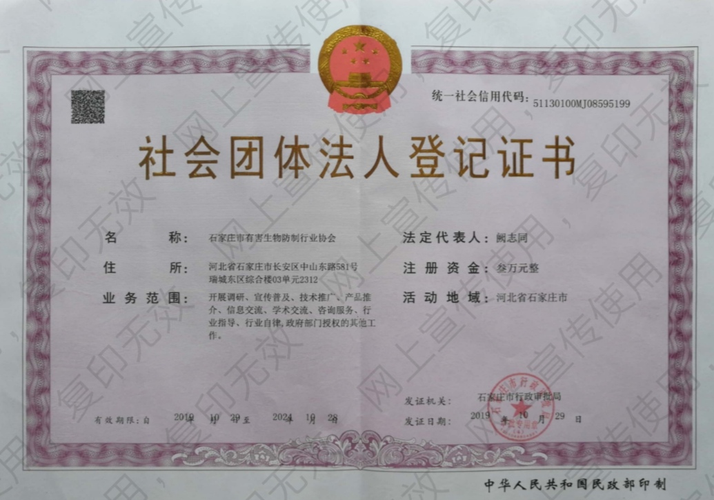 石家庄市有害生物防制行业协会接受石家庄市行政审批局、石家庄市民政局和政府相关部门的业务指导和监督管理。由在省会石家庄从事有害生物防制服务(灭蟑螂、老鼠、蚊蝇、蚂蚁、跳蚤等)、消毒服务、杀虫药械生产推广应用的经济实体,以及从事爱卫、疾病控制、科研、教学、管理的单位和个人自愿组成的学术性、联合性、行业性、地方性非营利性社会组织,依照章程独立自主地开展活动。协会为会员提供相关服务,维护行业、会员的合法权益和共同经济利益,维护市场秩序和公平竞争,沟通会员与政府、社会之间的关系,推动行业健康发展,在促进社会有害生物预防控制、保障人民身体健康方面发挥行业协会的积极作用。