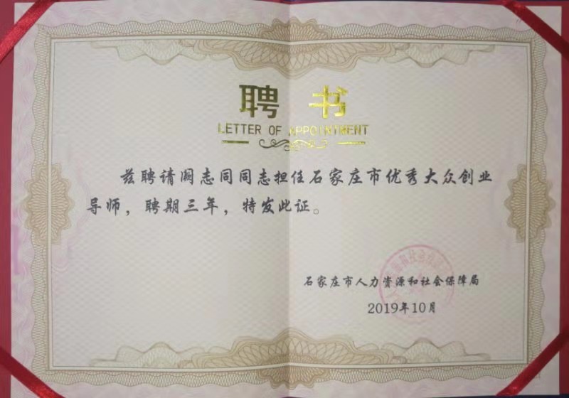 近日,经石家庄市人力资源和社会保障局批准,聘请我们石家庄市有害生物防制行业协会会长阙志同,担任石家庄市优秀大众创业导师。