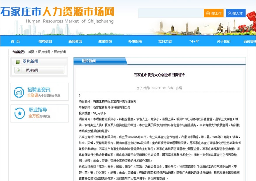 石家庄青松环保科技有限公司,有害生物防制项目入选石家庄市优秀大众创业项目资源库。