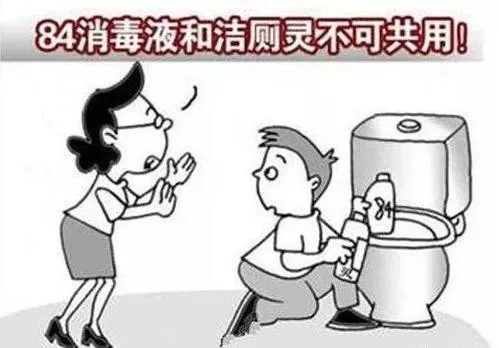 六、特别注意!84消毒液绝对不能与洁厕剂混合后使用!84消毒液的主要成分次氯酸钠(NaClO)与洁厕灵的主要成分——盐酸(HCl)混合后会发生化学反应生成氯气。氯气是一种刺激并损坏呼吸道的气体,大量吸入的话,会使人咳嗽、呼吸困难,甚至头晕。两整瓶这样的东西混合,产生的氯气足以危及生命。